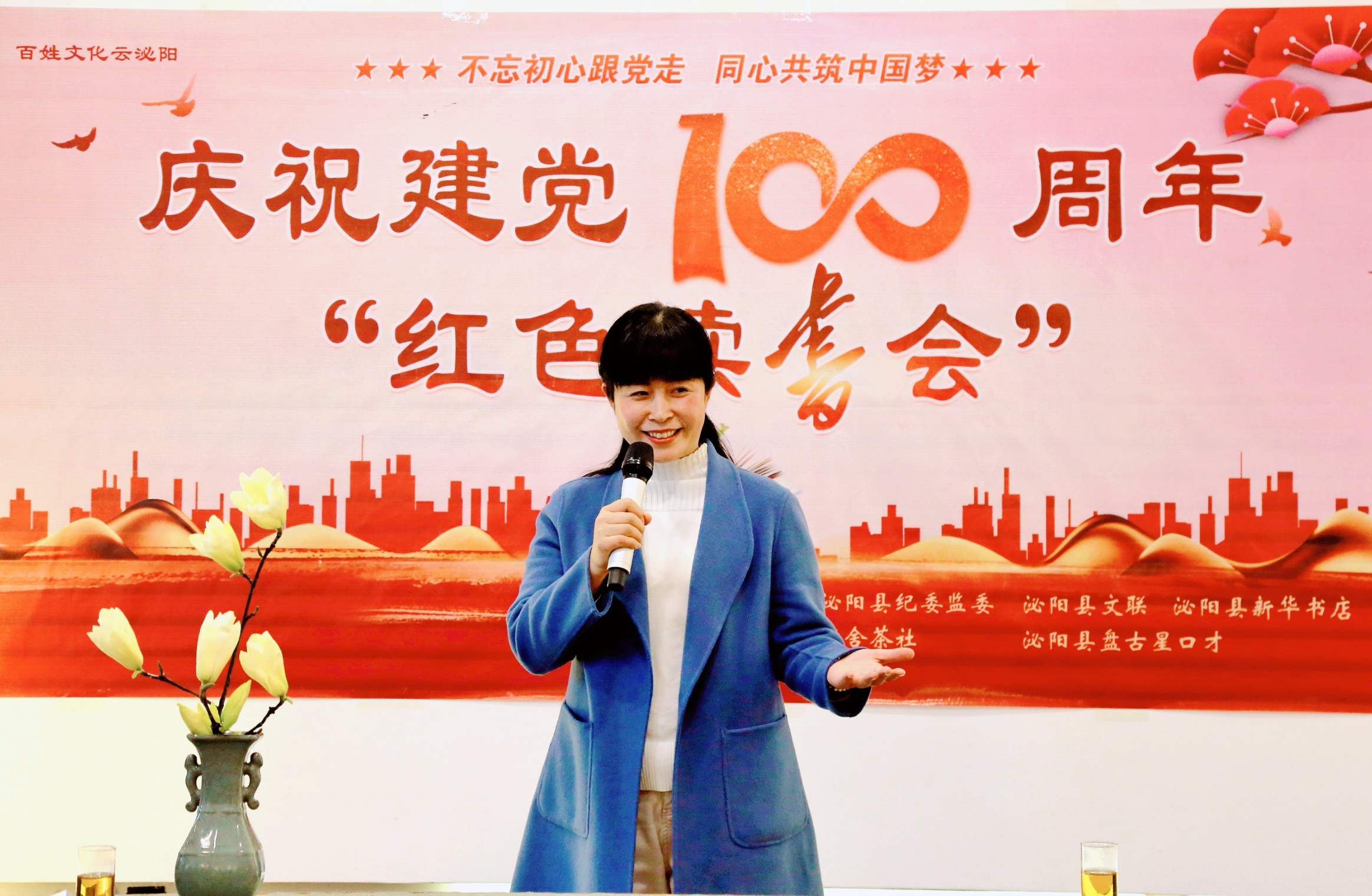 春回大地,百花盛開。為了豐富紅色知識,讀紅色經典,堅定“四個自信”,多讀書,讀好書。3月19日,由泌陽縣紀委監(jiān)察委、縣文聯(lián)、縣新華書店、縣電視臺、縣融媒體聯(lián)合舉辦的以“不忘初心跟黨走,同心共筑中國夢”為主題的慶祝建黨100周年紅色讀書會在泌陽縣“靜舍書茶社”舉行。來自不同單位的演講代表,以豐富的情感朗誦紅色經典,講述先烈故事,大家共誦經典、聆聽書韻,以飽滿的熱情慶祝中國共產黨建黨100周年。