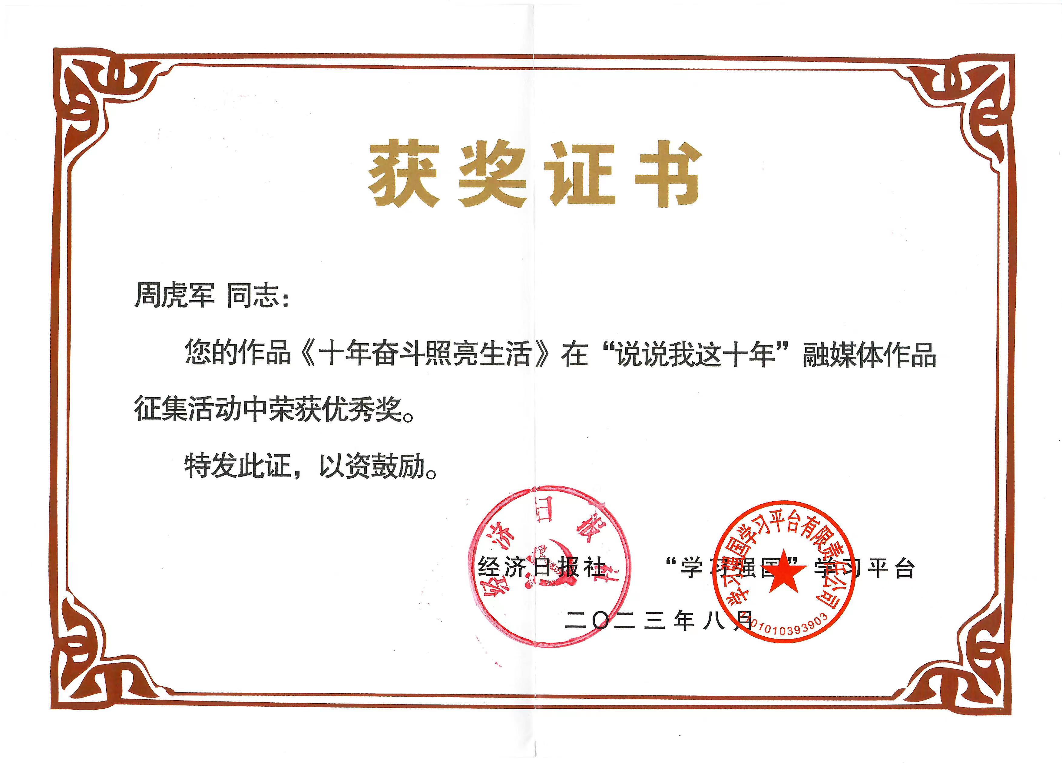 經(jīng)專業(yè)評(píng)選委員會(huì)嚴(yán)格評(píng)審,共有105篇投稿作品獲獎(jiǎng),其中“一等獎(jiǎng)”2篇,“二等獎(jiǎng)”5篇,“三等獎(jiǎng)”10篇,“優(yōu)秀獎(jiǎng)”88篇。鞏義市店員工周虎軍的作品《十年奮斗 照亮生活》榮獲“優(yōu)秀獎(jiǎng)”。
