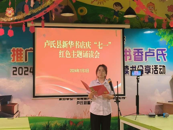 7月3日,盧氏縣店舉辦慶“七一”紅色主題誦讀會,百姓文化盧氏云進(jìn)行現(xiàn)場直播。誦讀會內(nèi)容豐富、形式多樣,《跨越百年的承諾》《紅色的七月》《紅船的方向》等精彩節(jié)目依次上演,黨員干部們用朗朗書聲為黨慶生,歌頌中國共產(chǎn)黨的偉大成就,現(xiàn)場氣氛和諧熱烈。