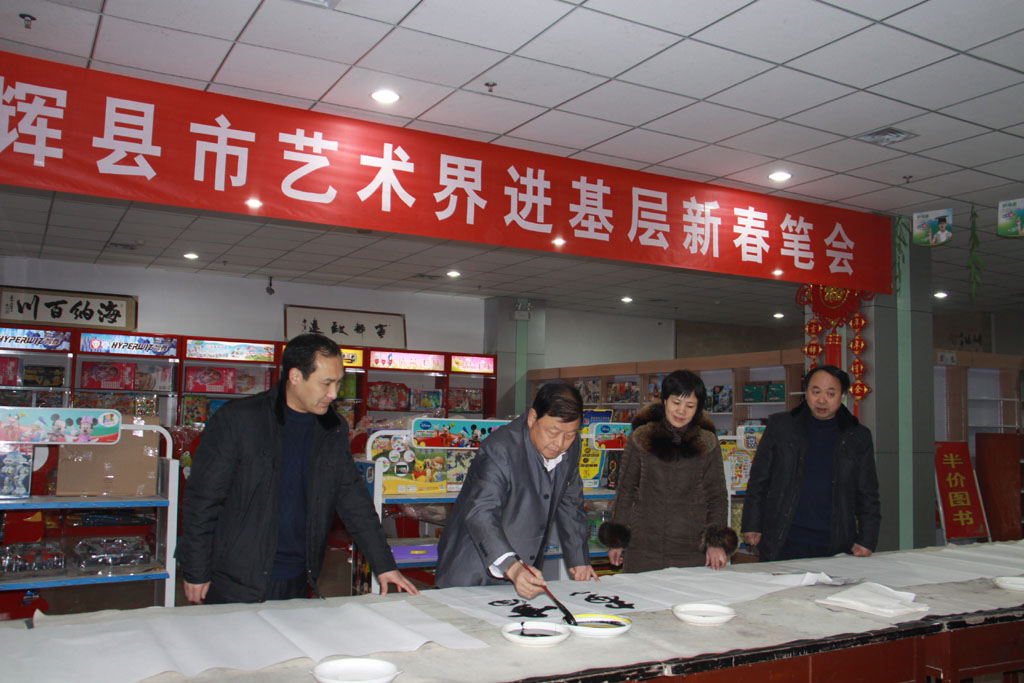 為活躍廣大讀者及全店職工的娛樂生活,豐富廣大讀者和全店職工的文化活動(dòng),營造喜慶祥和的節(jié)日氛圍, 1月14日,輝縣市店在圖書大廈四樓舉行“輝縣市藝術(shù)界進(jìn)基層新春筆會(huì)”,為廣大讀者送去豐盛的文化食糧。 活動(dòng)中,輝縣市書法協(xié)會(huì)的十位協(xié)會(huì)會(huì)員現(xiàn)場揮毫潑墨,創(chuàng)作了多幅風(fēng)格各異的行、草、隸、篆等書法作品,使廣大讀者大開眼界,讓大家領(lǐng)略到了中國書法藝術(shù)的陽剛大氣、博大精深之美,提高了大家的審美情趣, 抒發(fā)出對(duì)新一年的美好祈愿。