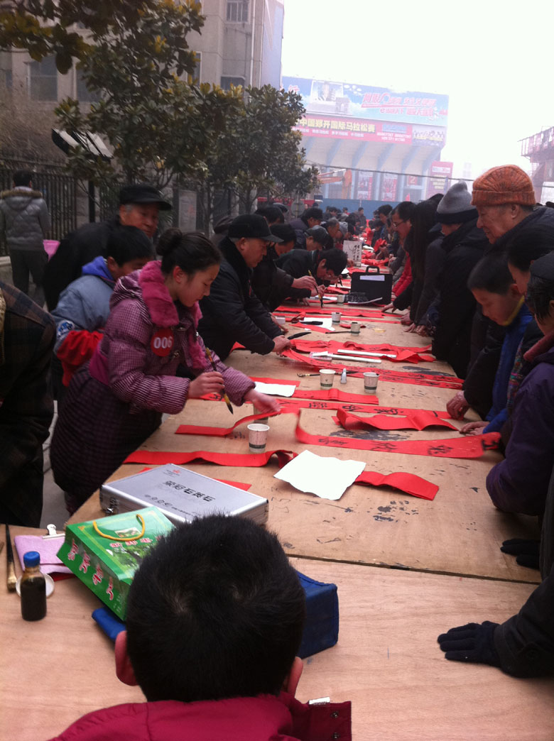 鄭州海外國際旅行社的兩位工作人員特意趕到現(xiàn)場,免費發(fā)放印制的春聯(lián)和大紅福字,500副春聯(lián)很快一搶而空。