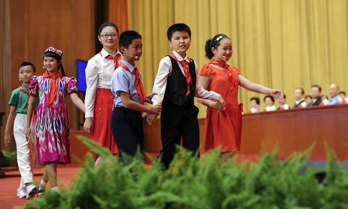 這是少先隊(duì)員代表向大會(huì)獻(xiàn)辭。