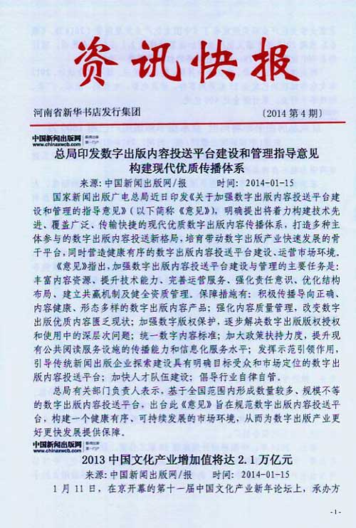 來源:河南省新華書店發(fā)行集團有限公司  作者:河南省新華書店發(fā)行集團有限公司  發(fā)布時間:2014/1/17 9:54:31  閱讀次數(shù):7970
