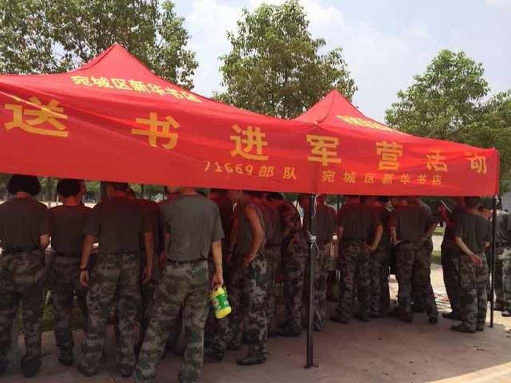 為慶!鞍艘弧苯ㄜ姽(jié),宛城區(qū)店組織員工利用節(jié)假日,不畏酷暑,頂著烈日,開(kāi)展“送書進(jìn)軍營(yíng)”慰問(wèn)展銷活動(dòng)。