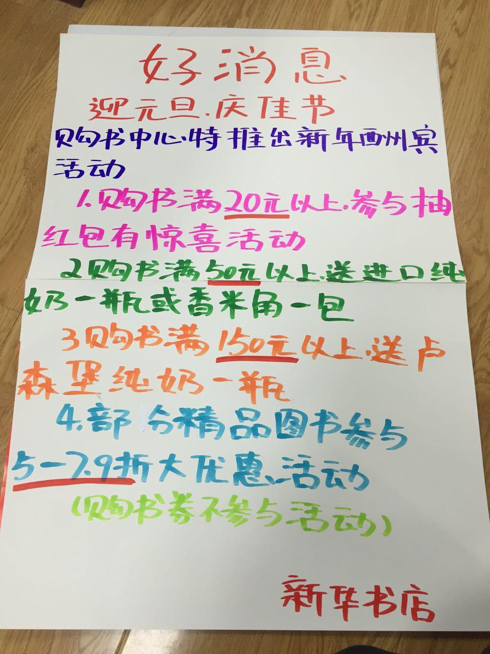 喜迎元旦,歡慶佳節(jié)。新密市店在2016年元旦來臨之際,為回饋廣大讀者,積極推出購書抽獎(jiǎng)、購書贈(zèng)禮、打折優(yōu)惠等營銷活動(dòng),另外還精心布置賣場(chǎng),營造節(jié)日氛圍,抓住消費(fèi)契機(jī),拉動(dòng)銷售增長(zhǎng)。